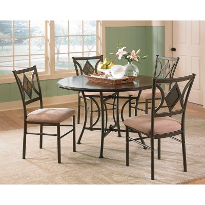 Dark brown powder-coated metal base and chairs are accented by diamond-shaped slate inserts adding a hint of color