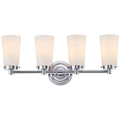 The shape and warm glow of the flared White Opal glass shades are complemented by the clean lines and lustrous Chrome finish of the bar and wall plate