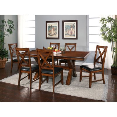 The X motif in the chair backs and table base lend a rustic look to this dining set.