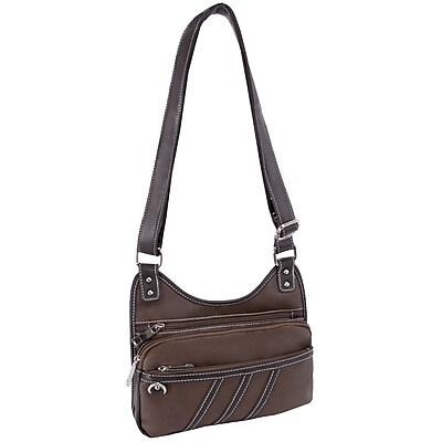 This multi-zip bag in brown is made from high quality pebble grain faux leather for durability The strap can be adjusted as per your comfort and style Measuring 8.5 (h) x 10 (w) x 1.5 (d) , this crossbody bag is small in size and easy to carry around