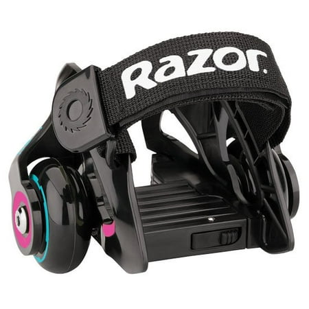 Razor Jetts Heel Wheels, Purple - Strap-on wheels with heel-activated sparking action - Durable 50 mm urethane wheels with 88a hardness - Low center of gravity - Easily removable and replaceable spark pads - Wheels and sealed bearings offer durability - Heavy-duty polymer quick-click frame - Hook and loop straps for easy on and off - Adjustable from youth size 12 to adult size 12 - Designed for ages 8 and up using the spark feature or ages 6 years and up without the spark feature - Includes spark pads and owner's manual - No assembly required - User weight limit: 176 pounds - Colors: Purple and black - Dimensions: 5 x 5 x 3.5 inches - Weight: 1.2 pounds Part number: 25056150 - 90 day Razor warranty against product defects