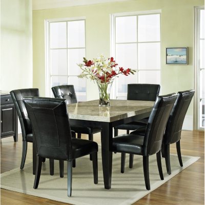 Featuring a sleek combination of espresso-finished hardwoods and a marble veneer table top surface, the Brockton dining collection has a casual design with rich styling