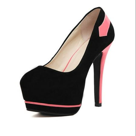 Imitation Suede Vamp, Round Toe, Color Block, PU Insole, Rubber Outsole, Imitation Leather Detail, Hidden Platform, Stiletto High Heels, Pumps
