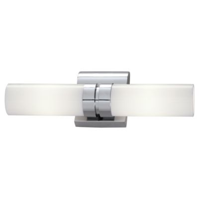 Within this curve rest two cylindrical Shiny Opal glass shades, their glistening surfaces complemented by either a similarly glistening Chrome finish or soft Brushed Nickel