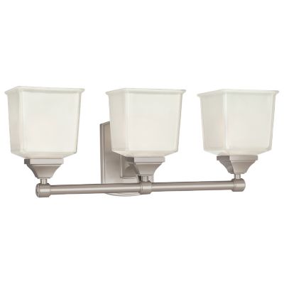 The Oak Harbor Bath Bar features beveled soft square Frost Lichen glass shades, metal body and textured Rustic Burnished finish