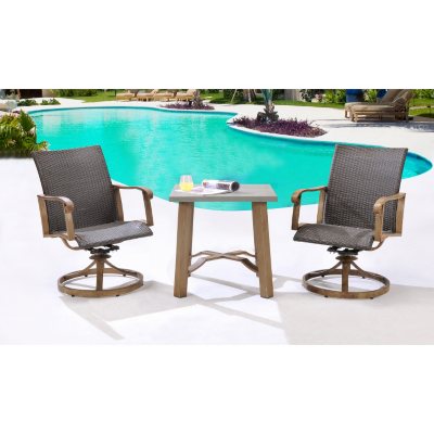 This trendy set includes two swivel rocking chairs and one square bistro table