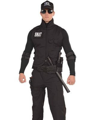 Black tactical vest features a SWAT patch and several pockets for all of your police utilities.SWAT Adult Vest includes: Vest Only SWAT Costume not included Sized for Adults